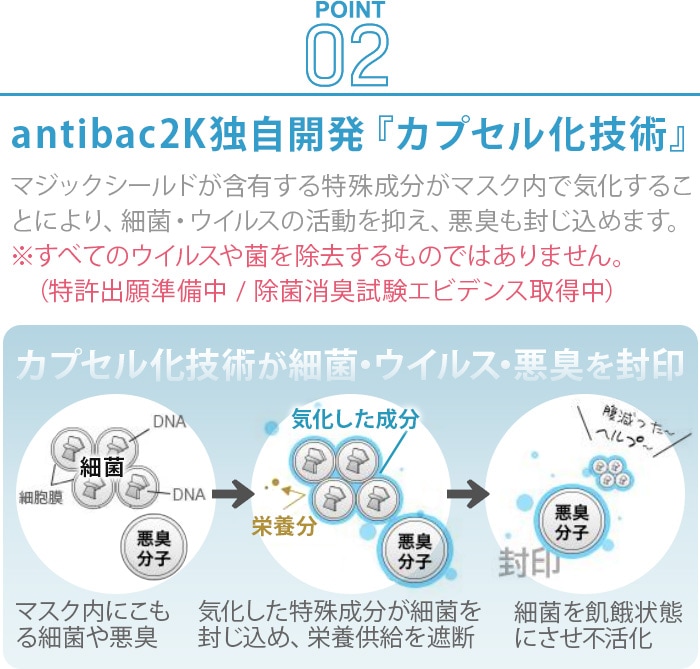 マスク内はとにかく衛生環境が良いとは言えない状況。今すぐ、何とかしたい!!と思い始めた方も「マジックシールド」をマスクにペタッと貼るだけで、除菌・消臭効果が衛生的にマスク内を管理してくれます。 さらにスーッとするほのかに香る爽やかな香りが呼吸するたび清々しくリフレッシュさせてくれます。1日中いい香りが続き、気分がいいので一度使うと手放せない存在に。