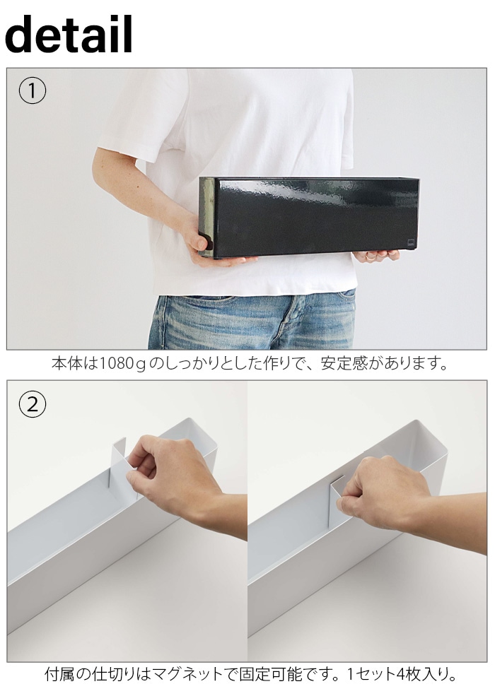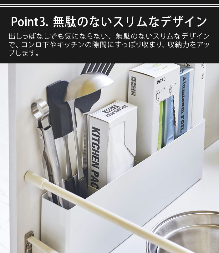 ラップやポリ袋などのボックス類、キッチンツール・まな板などを一括収納!好きな場所に置くだけの簡単設置で、シンク下やコンロ下などの狭いスペースを有効活用!仕切り板はマグネットで固定できるので、置くものによって使いやすくカスタマイズできます。