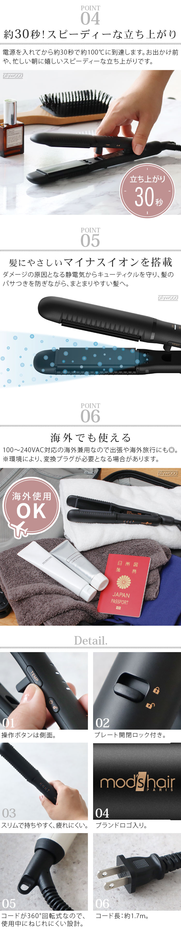 使用感と仕上がりを追求した「モッズヘア/mod's hair」から、使いやすく、ヘアアレンジしやすいワンカールアイロンの登場です。独自のプレートで髪がするんとすべるような使い心地。髪の水分を蒸発させにくいのでしっとりさらさらの仕上がりです。140/180/200℃の3段階の温度調節が可能。海外兼用※なので海外旅行などにも◎。※環境により、変換プラグが必要となる場合があります。