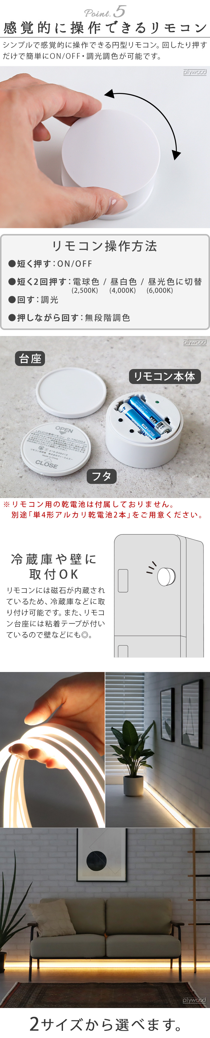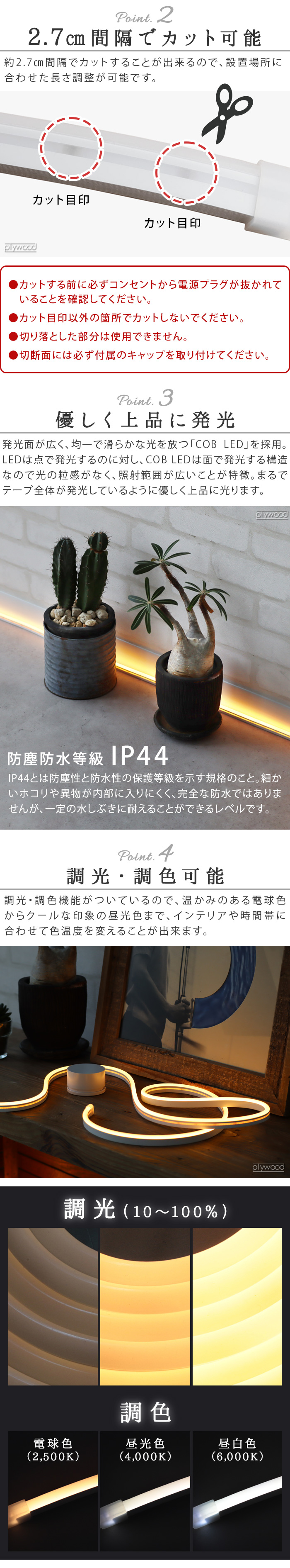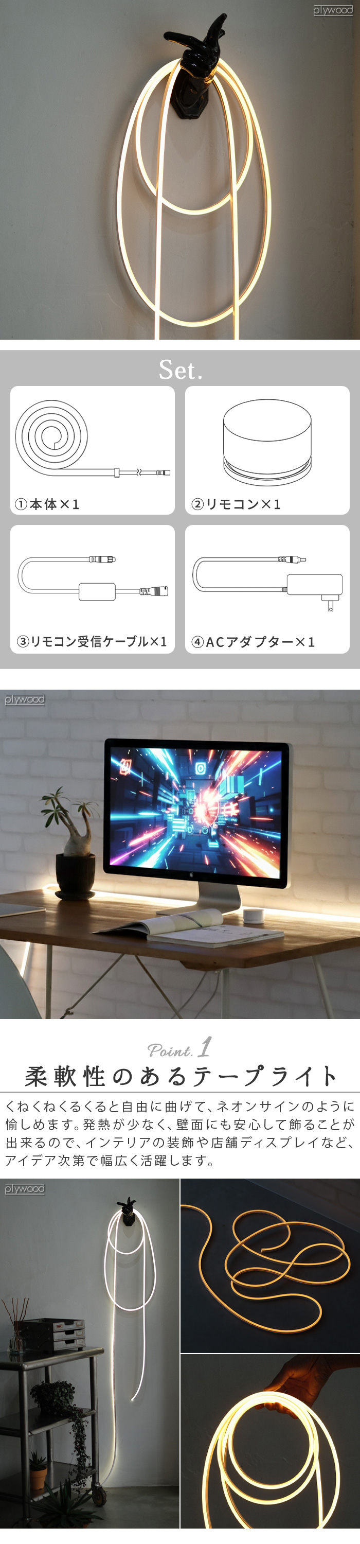柔軟性があるシリコン製のLEDテープライトのご紹介です。くねくねくるくると自由に曲げてネオンサインのようにお愉しみいただけます。コンセントがあればどこにでも設置が可能。設置したい場所に合わせて2.7cm間隔でカットができます。優しく上品に発光するLEDライトは発熱が少なく、壁面にも安心して飾ることが出来るので、インテリアの装飾や店舗ディスプレイなど幅広く活躍します。付属のリモコンを回したり押すだけでON/OFF、調光調色を操作できます。