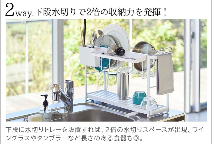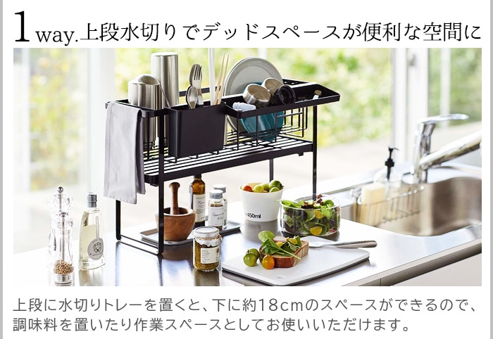 おしゃれな収納グッズを多数発信する山崎実業の「tower(タワー)」シリーズより、かしこくたっぷり置ける水切りワイヤーバスケットのご紹介です。サイズは選べる2種類。「スリムツーウェイ水切りワイヤーバスケット」は、高さ約18.5cmの平置きタイプ。スリムさが魅力の2wayタイプは、水切りトレーと製品本体を分けて、違う場所で使用することが可能!本体をシンクの上に設置すれば、お皿やカトラリーを本体に、カップやグラスを水切りトレーにと使えて、収納スペースが2倍になります※。もちろん、水切りトレーを本体に設置してシンク周りをすっきり使うことも◎。スペースにマッチする使い方ができます。もうひとつのサイズ「スリムスリーウェイ水切りワイヤーバスケット」は、便利なワイヤー水切り2段設計。トレーをお好きな段に設置できます。高さが約33.5cmあるので、水切りトレーを上段に設置いただければ、下部にスペースが生まれ作業場所を確保!デッドスペースを有効に活用いただけます。もちろん2wayタイプ同様、トレーと本体を分けてお使いいただけます。各サイズともに、布巾掛けスペースやカトラリーポケットなど、あったらいいな!なデザインや機能も充実です。 気になるカラーは、重厚な存在感のある「ブラック」と、さわやかさと清潔感を兼ね備えた「ホワイト」の2色。インテリアに合わせてお選びいただけます!スマートな水切りワイヤーバスケットで、くらしのクォリティが上がりそうです♪ ※上部画像「セパレート使い」をご参照ください。
