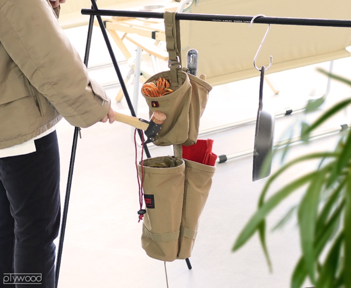 アメリカ/オレゴン州で1960年代後半に産声をあげた老舗アウトドアブランド「Oregonian Outfitters」の、日本規格キャンピングギアブランド「Oregonian Camper」から、ツールハンガーなどに下げて使える[バーチカルポケット]のご紹介です。 4つのポケットが付いたハンギングタイプのギア収納。上2つは小物などを収納しやすい、小さめのポケット。下2つは、トングなどが入る深い大きさのポケット。2つの大きいポケットの内側には、汚れが付きにくいPVC加工が施されているので、泥が付いたペグやハンマーなどをそのまま入れても、サッと拭いてお手入れがカンタンです。ポケットは取り外せて、位置を変えるなどのカスタマイズも楽しめます。下部にはペグで地面に固定できるコードが付いており、風が拭いてもフラフラせず使いやすい設計です。 ※本製品にはカトラリーや調理器具などは付属しません。ご了承ください。