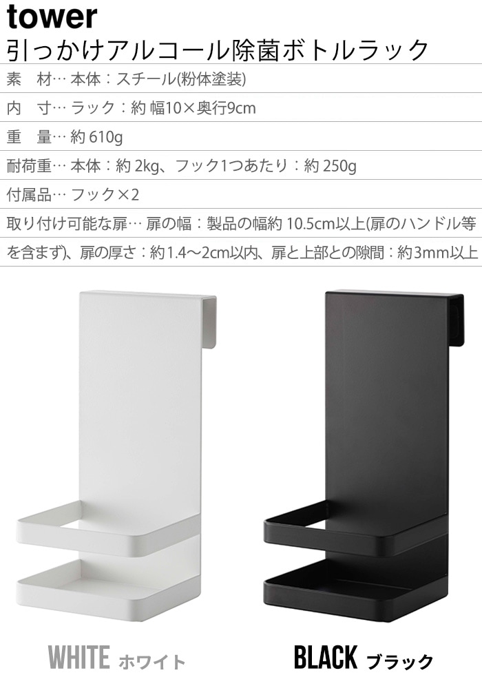 スマートな収納グッズを多数発信する山崎実業の「tower(タワー)」シリーズから、生活にかしこくプラスできる、引っかけアルコール除菌ボトルラックのご紹介です。 帰宅後のアルコール消毒が習慣になってきた近ごろ。毎日のように使うけど、置き場所に困りがちな除菌ボトル…そんなお悩みを解決できるこの商品!玄関や洗面所の扉に引っかけるだけで、除菌ボトルの定位置を作ることができます。これで毎日の除菌習慣が快適に♪