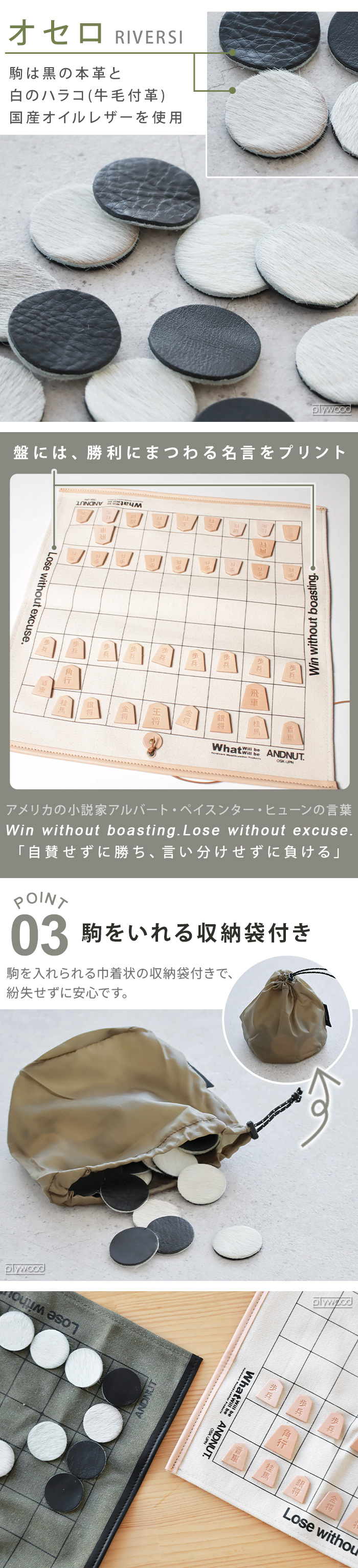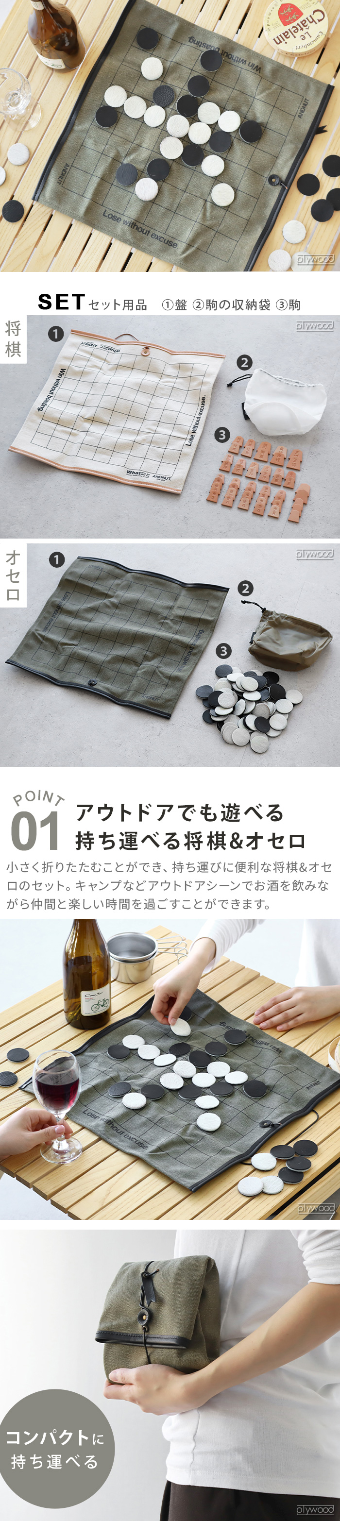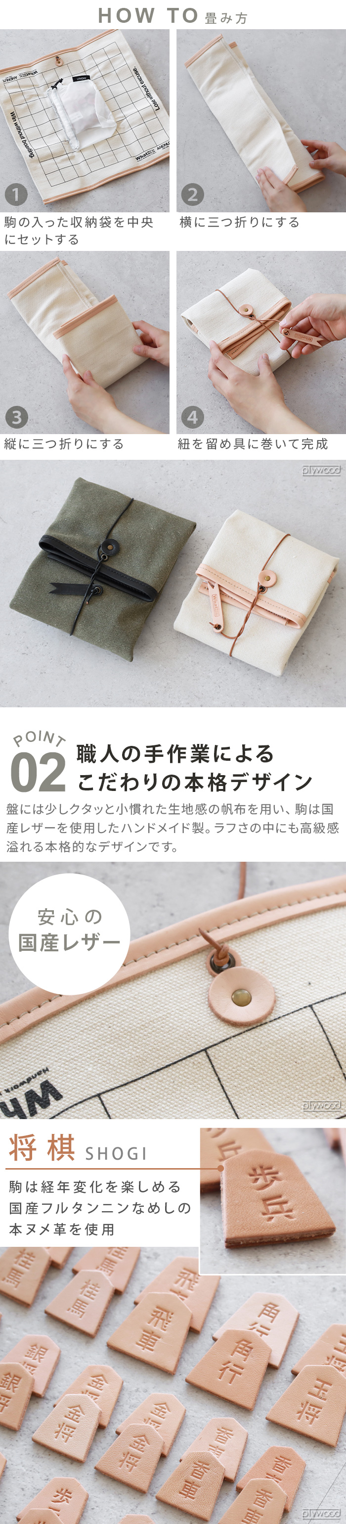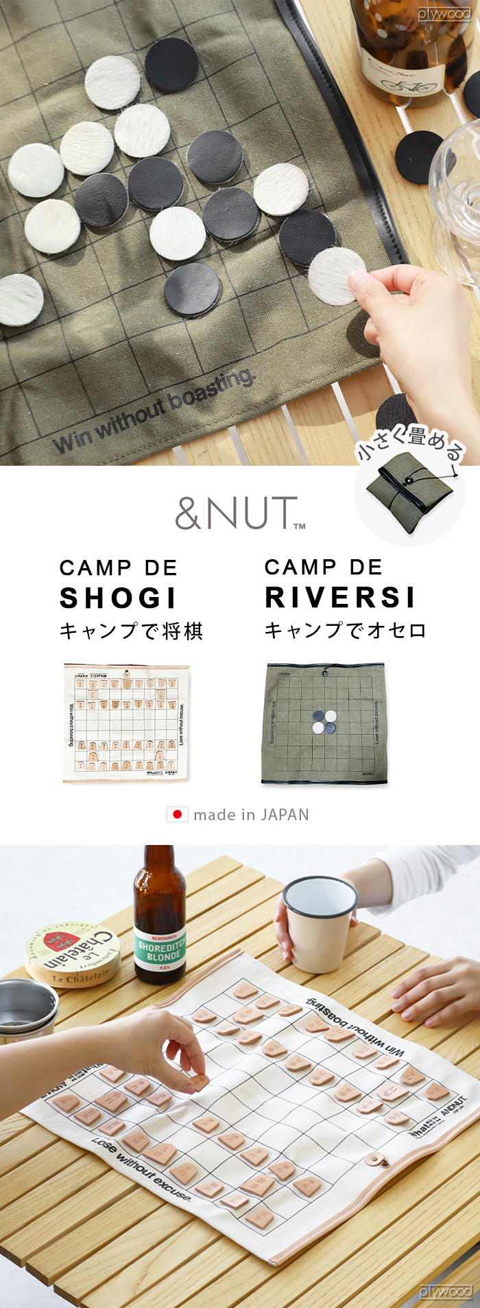 雑貨メーカー what.will.be.will.be.japan×&NUTコラボのオトナのおもちゃ、将棋とオセロ。小さく折りたたむことができ、キャンプなどアウトドアシーンでワインや日本酒を飲みながら仲間と楽しい時間を過ごせます。もちろん自宅で家族やお子様と一緒に遊ぶのも◎。盤には少しクタッと小慣れた生地感の帆布を用い、駒は国産レザーを使用したハンドメイド製。ラフさの中にも高級感溢れる本格的なデザインでギフトにもおすすめ。