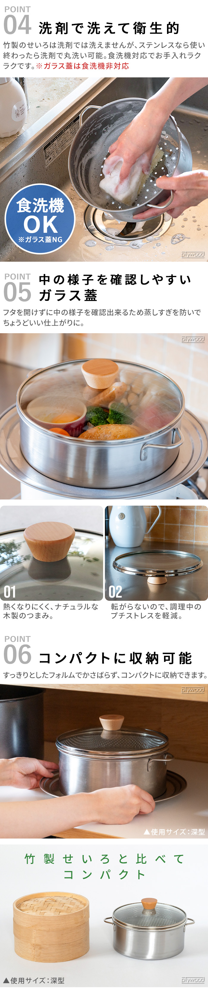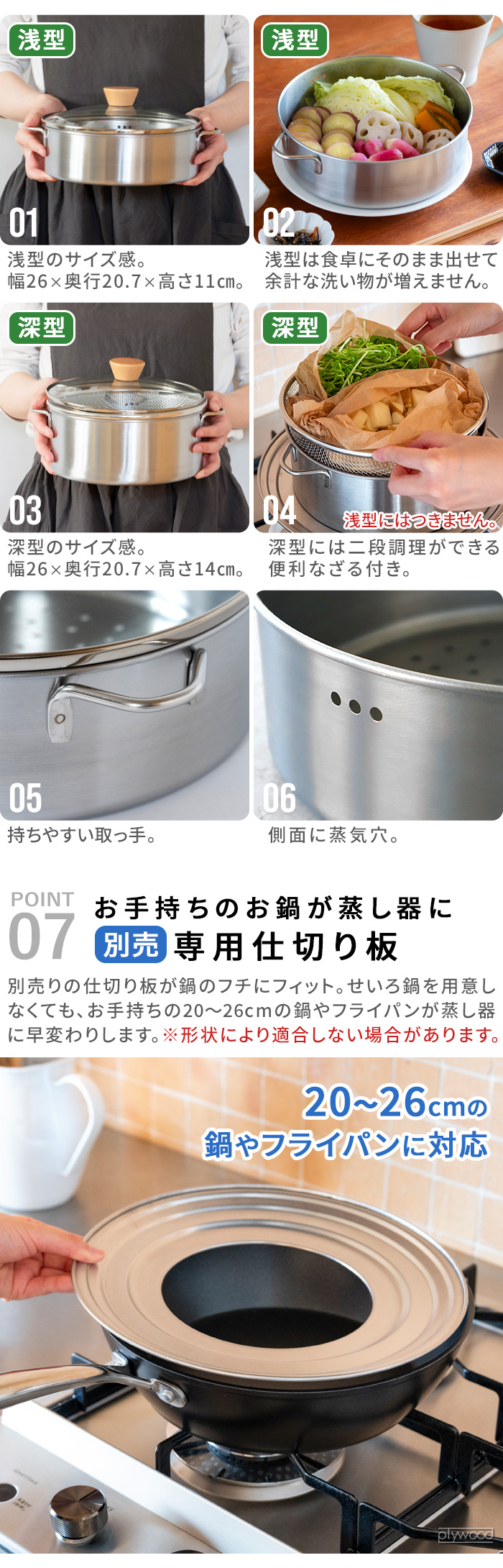 道具を使う人の気持ちに寄り添い、快適さを提供する「bws SELECTION」から、ステンレスせいろのご紹介です。ヘルシー料理が作れる竹製せいろには憧れるけど、取り扱いが難しそうと感じる方におすすめ!ステンレス製なので洗剤で丸洗いでき、食洗機もOK。カビの心配がなく、丈夫で長持ちします。肉や魚を直接置いてもにおい移りしにくく、クッキングシートなしで手軽に調理できます。別売りの仕切り板を使えば、お手持ちの直径20〜26cmのお鍋やフライパンで使用できます。